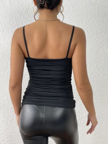 • Kadın kolsuz askılı yanları büzgülü degaje yaka sandy bluz