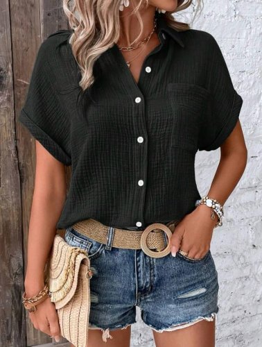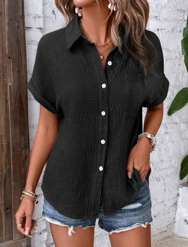 • Kadın Cep Detaylı Kısa Kollu Müslin Kumaş Gömlek