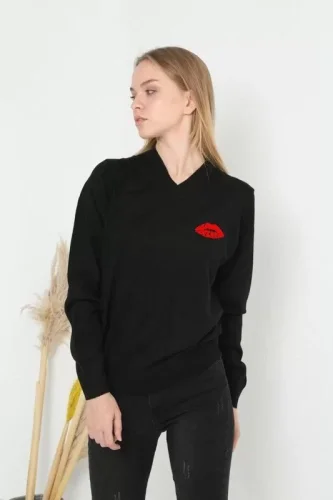 • Uzun Kol V Yaka Baskılı Dokuma Triko Siyah