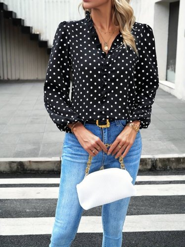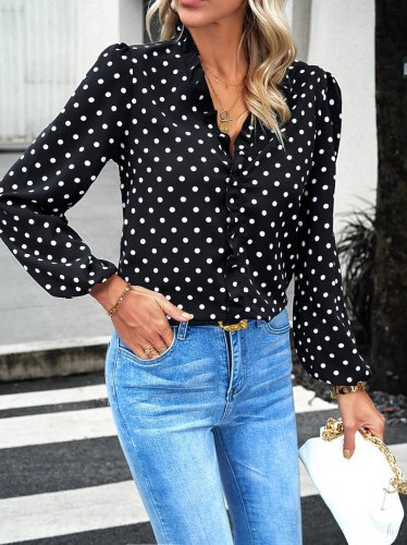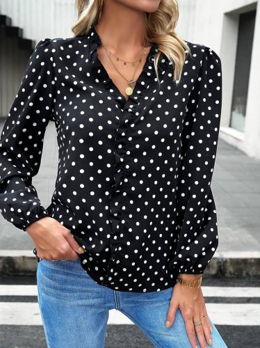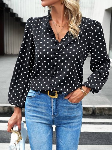 Kadın uzun kollu v yakalı fırfırlı puantiyeli krep bluz
