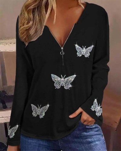 • Kadın uzun kollu önden fermuarlı taşlı kelebek desenli viskon bluz