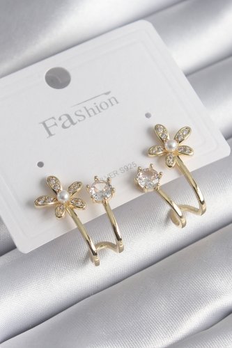 • Pirinç Gold Renk Zirkon Taşlı Çiçek Model İnci Detay Kadın Küpe