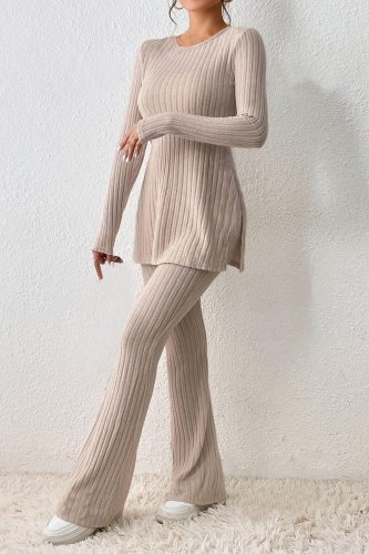 Bej Fitilli Yırtmaç Detaylı Uzun Pijama Takımı 7057