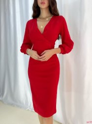 • Kadın kruvaze yaka balon kol midi boy elbise