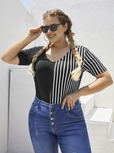 • Kadın kısa kollu çizgi desenli viskon büyük beden bluz