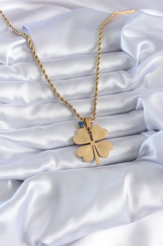 • 316L Çelik Gold Renk Burgu Model İşlemeli Yonca Figür Nazar Boncuk Detay Kadın Kolye